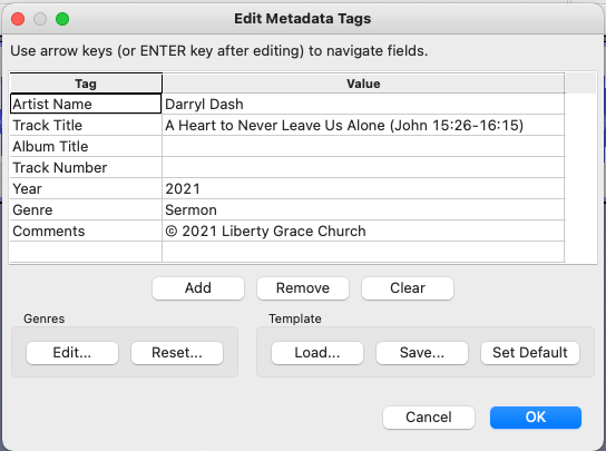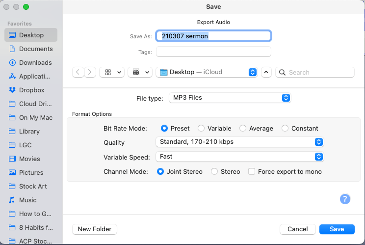 - Export the file to MP3 using the settings in the image below. (You can save these settings as a default). Be sure that the speaker, sermon title, and copyright year is correct.