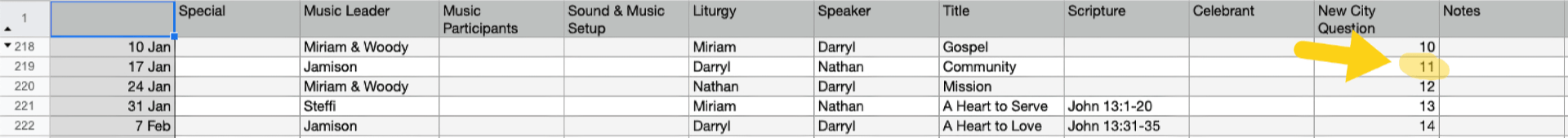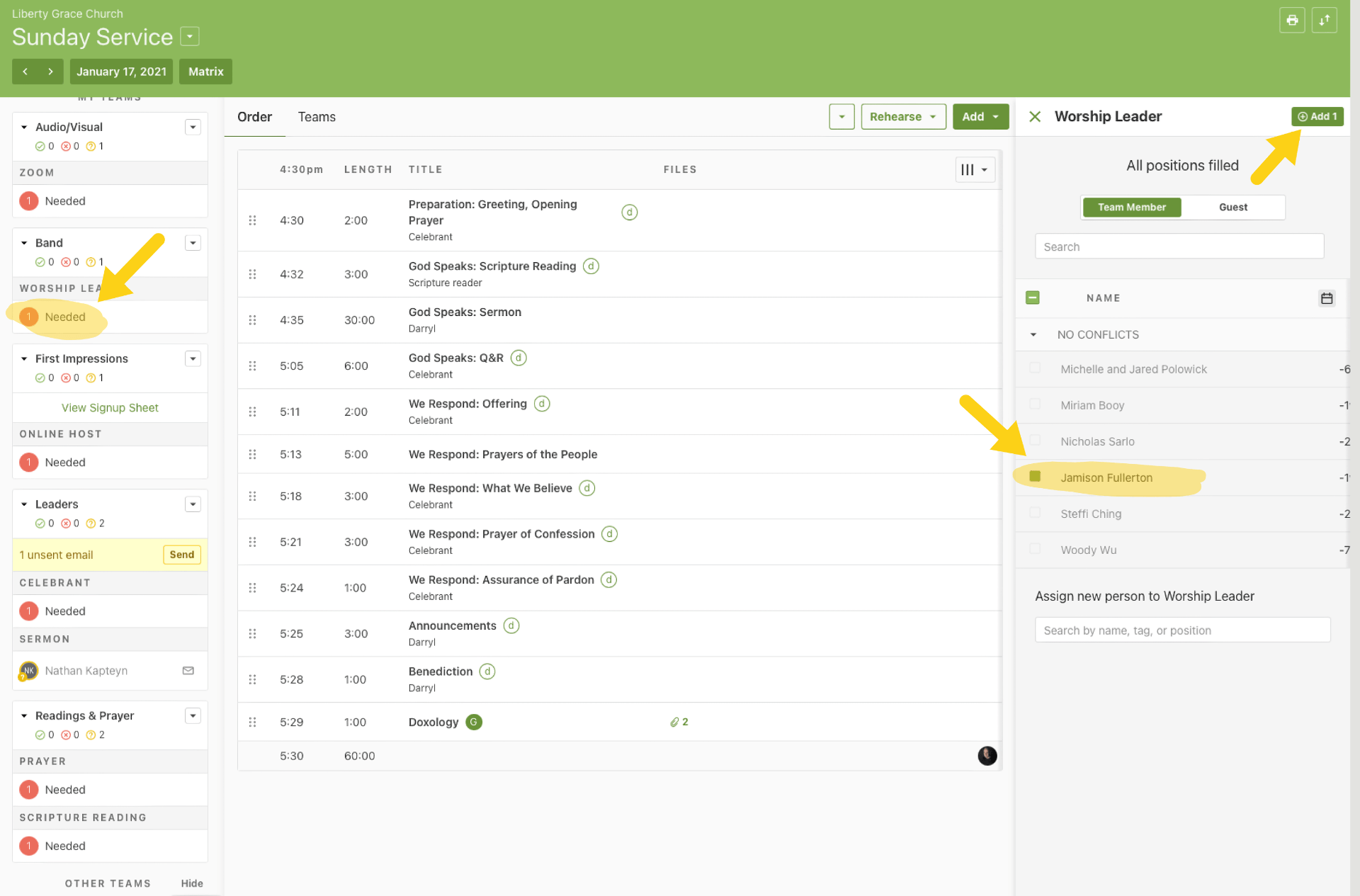 Assign roles for the needed positions on the left. Begin with the scheduled music leader and preacher. Fill in other roles beginning with the bigger roles (e.g. celebrant). In general, choose people who haven’t served in that role in a long time in that position. Avoid conflicts and pay attention to people’s preferences if they are set (e.g. to serve only once a month).