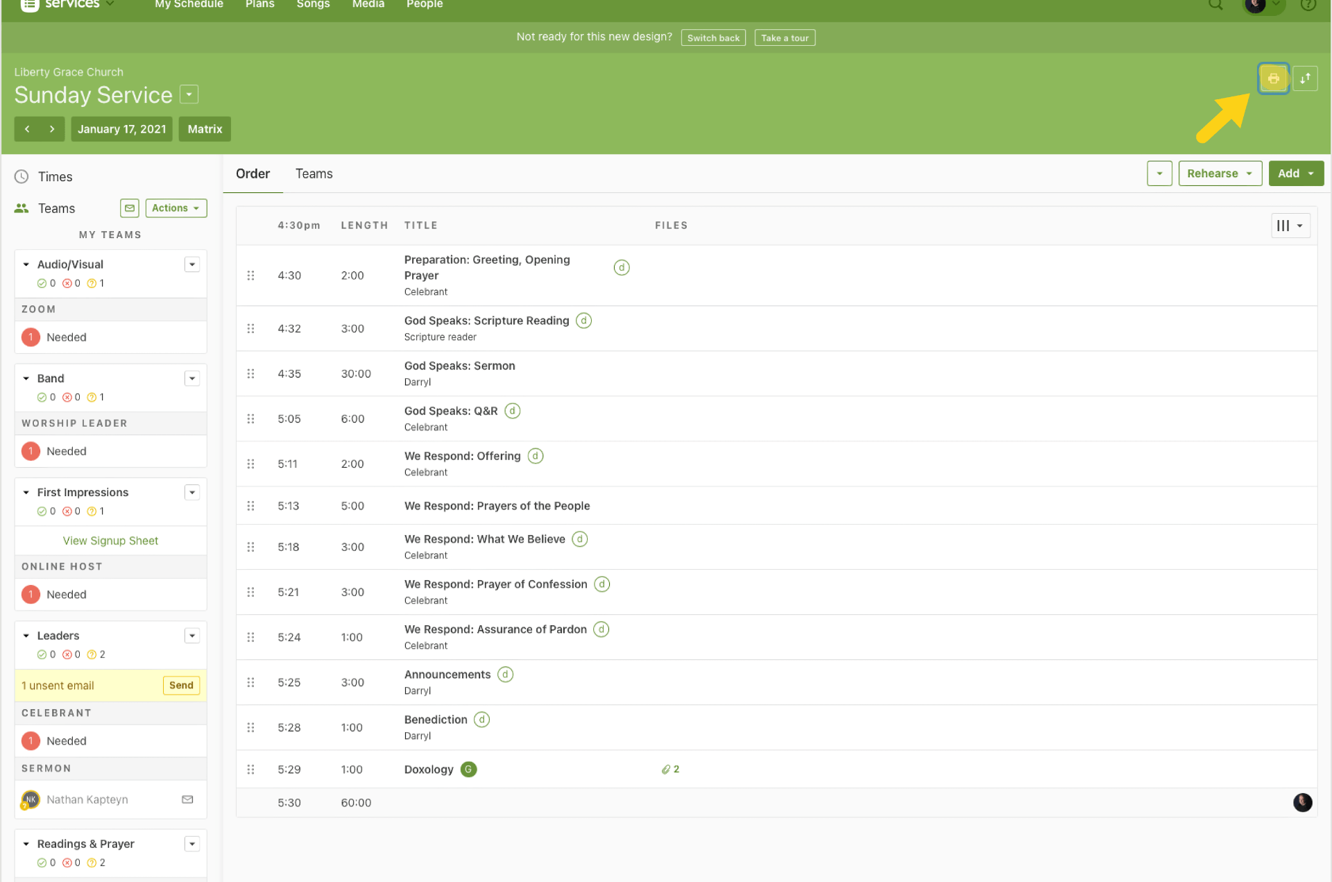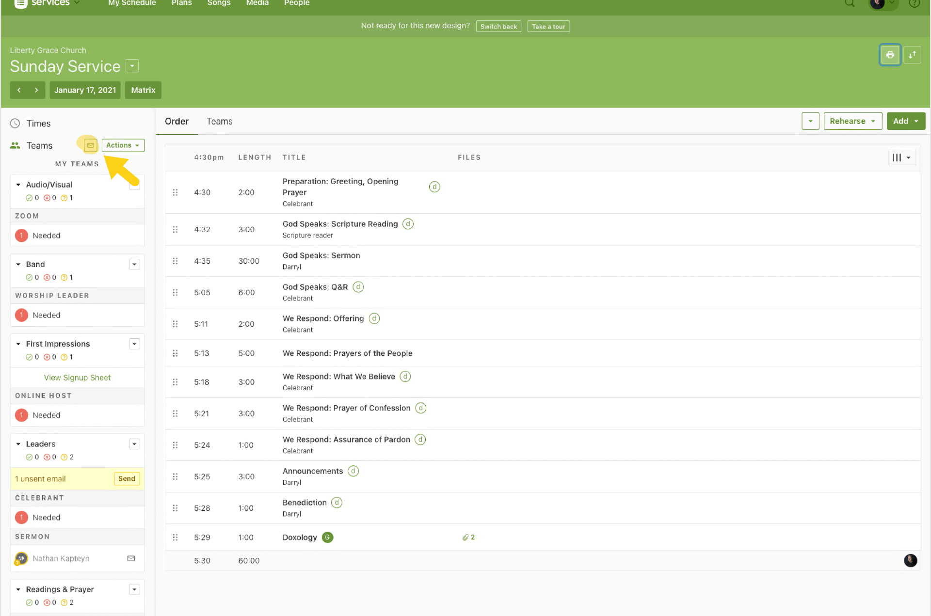 Go to Plans and choose the service for the coming Sunday.