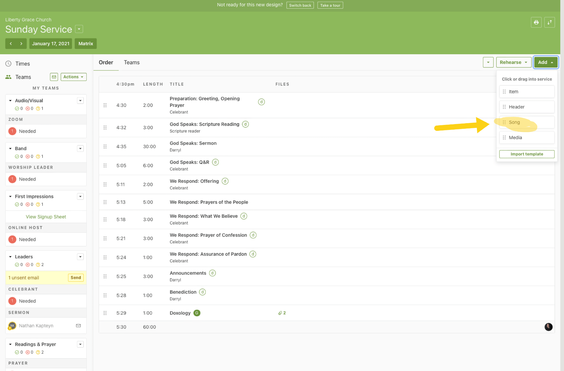 Add the songs to the order of service — two before the Scripture reading, and one after the offering. Choose “Add Song” from the menu and search for the song. Drag to the right place in the service.