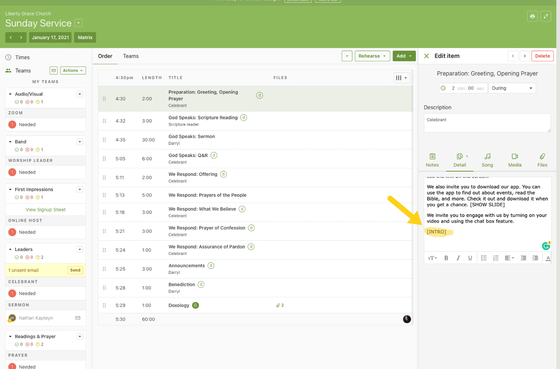 Click on the elements that need to be changed every week: Greeting, Scripture Reading, What We Believe, Prayer of Confession, Assurance of Pardon, and Benediction. Edit them as notes on the right-hand side.