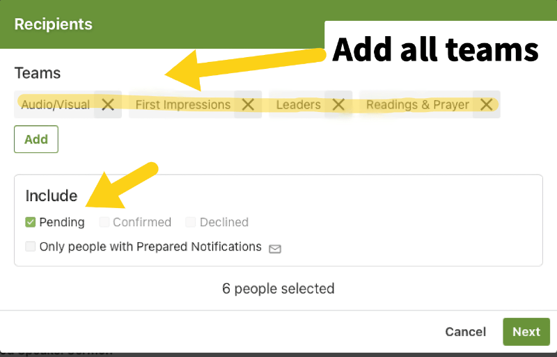 Once all roles are filled, email requests asking everyone to serve. Choose the email icon on the top left. Be sure to add all teams and choose pending only.